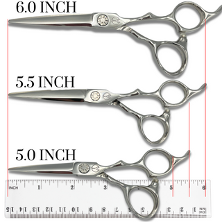 Introducing our Legacy Hair Shears Set, precisely crafted to meet the exacting standards of the professional hairstylist. This set includes a pair of 6.8-inch Hair Cutting Scissors and 6-inch Hair Thinning Shears, each forged from the highest-grade Japanese ATS-314 steel. This choice of steel is renowned for its exceptional sharpness, enduring durability, and superior edge retention, ensuring that every cut is performed with the utmost precision, a necessity in the refined world of professional hairdressing.